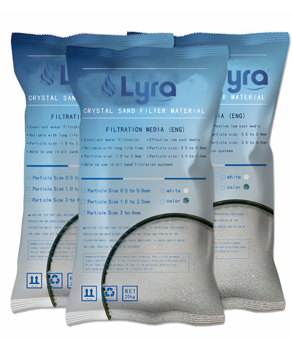 Lyra Pool Filter Sand Media is specially processed and graded to deliver efficient and reliable filtration in swimming pool sand filters. Packed in 25 Kgs bags, it ensures easy handling, accurate dosing, and consistent filter performance for clean and crystal-clear pool water.